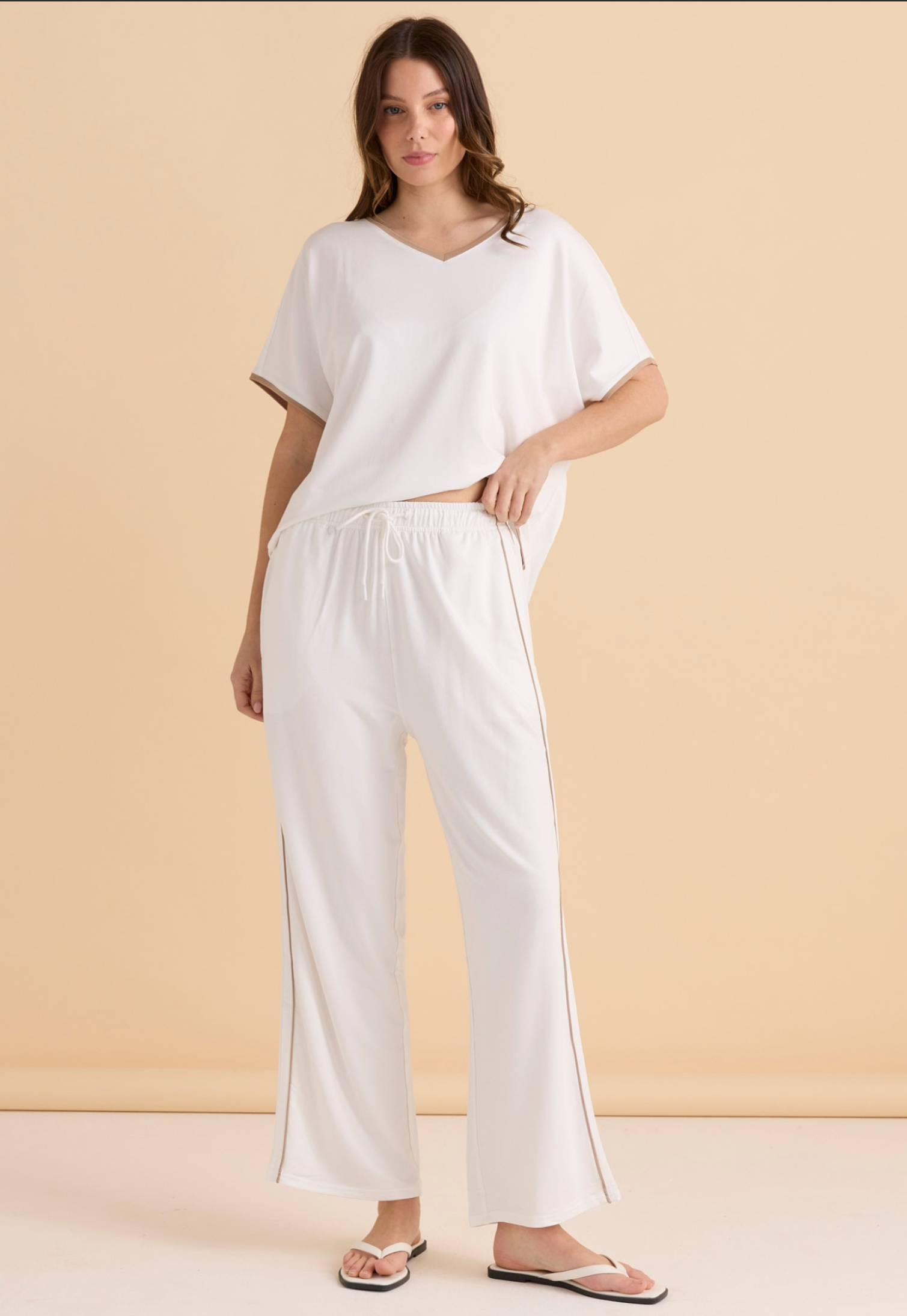 The Evelyn Wide Leg Jogger offers a relaxed yet elevated style with contrast trim detailing and an elasticated waistband. This mid-high rise fit is the perfect blend of comfort and on-trend design.