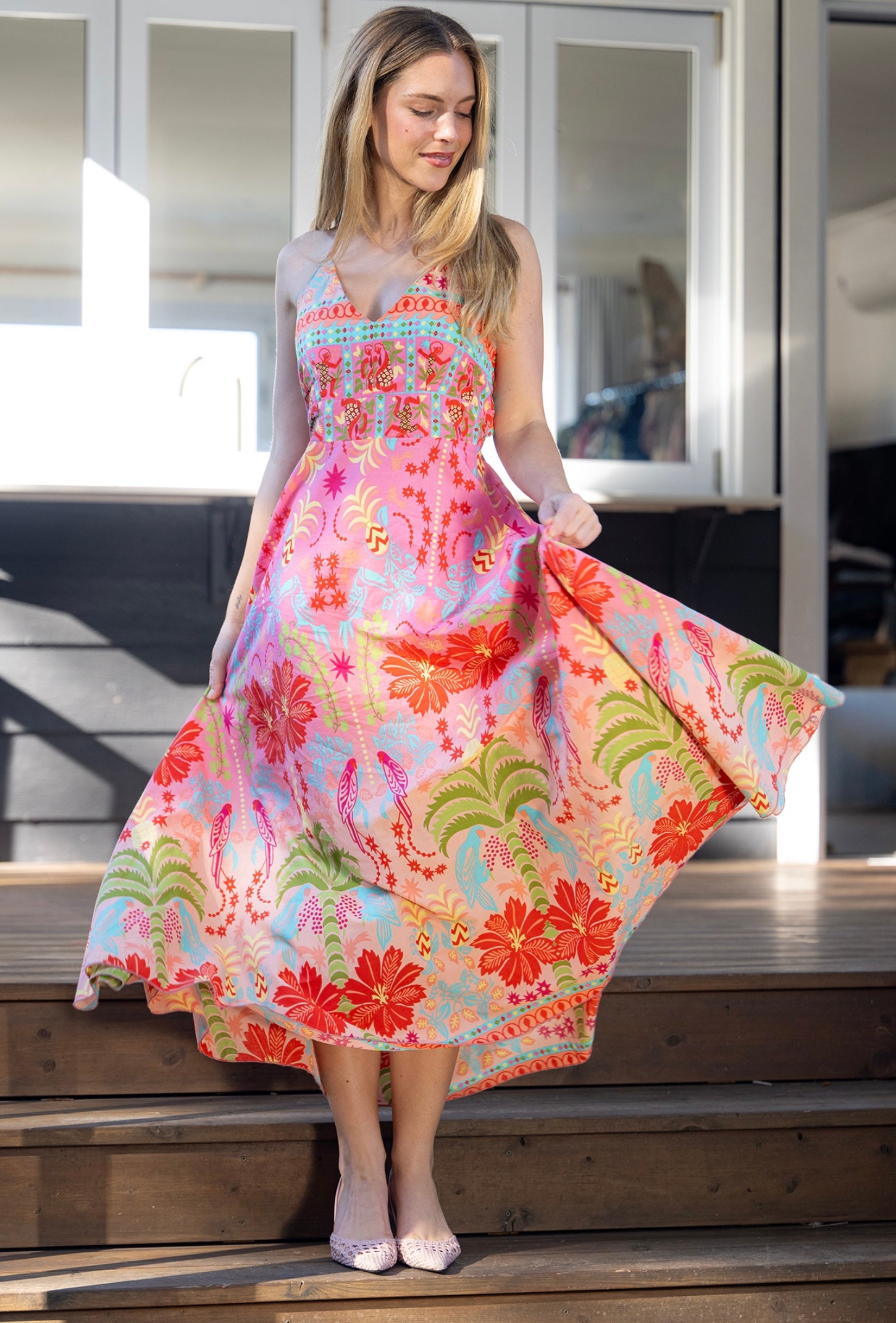 Featuring a vibrant bohemian floral print in pinks, corals, greens, and soft blues, it flows gracefully with every step.