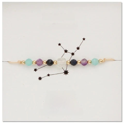 Delicate zodiac bracelets handcrafted with natural semi-precious stones, each chosen for its colour and traditional symbolism. Finished with subtle gold-tone spacer beads for a refined boho look.