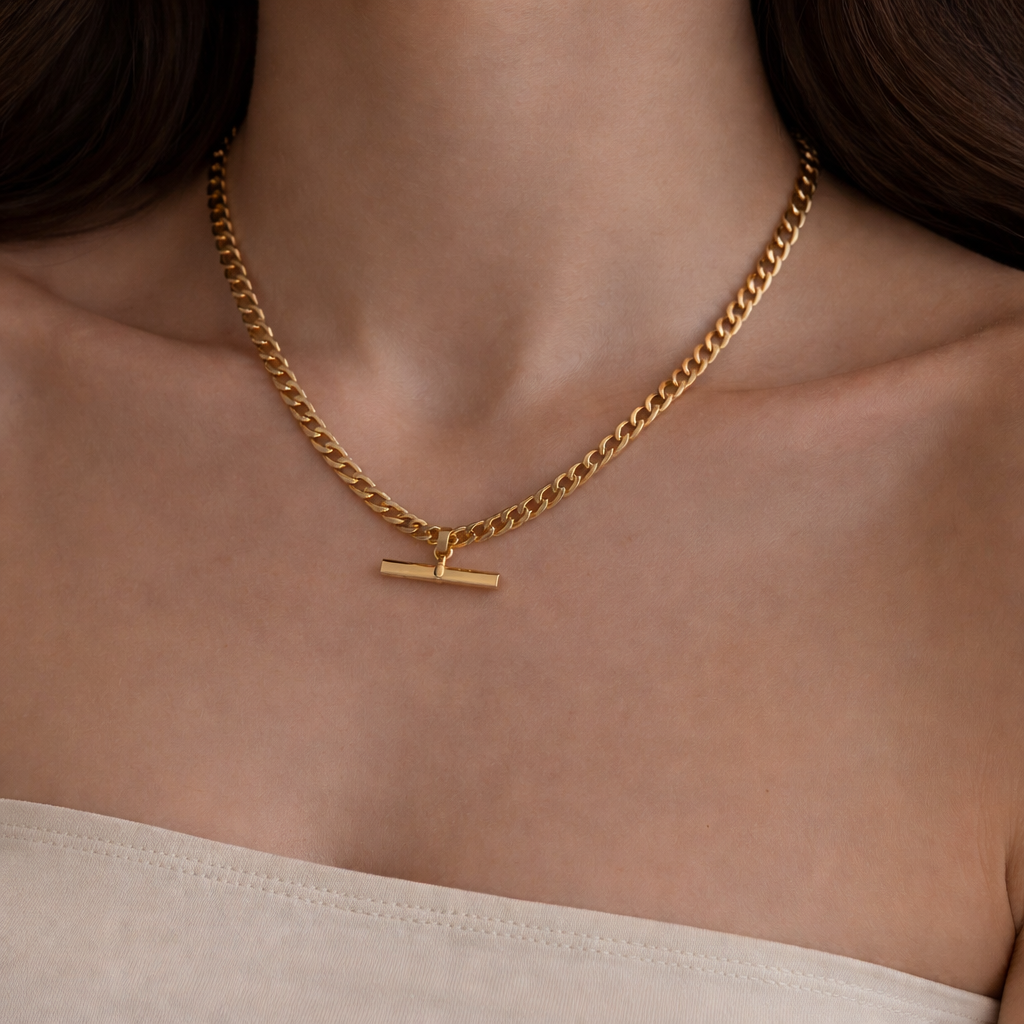 Available on either a Cuban chain for a slightly bolder feel or a Figaro chain for a classic, balanced profile. The geometric bar adds just the right amount of edge while remaining timeless and easy to style.